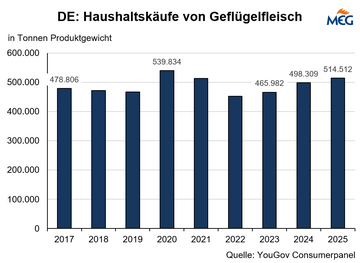 Deutschland Hähnchen Puten Verbrauch (MMB) Im Jahr 2025 kauften 84,8 % aller Haushalte mindestens einmal Geflügelfleisch. Damit lag diese Kenngröße 0,4 Prozentpunkte unter dem Niveau des Jahres 2024. Dies belegt die Auswertung des YouGov Consumerpanels.