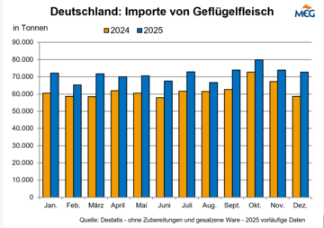 Außenhandel Deutschland Hähnchen Puten (AM) Im vergangenen Jahr steigerte Deutschland seine Importe von Geflügelfleisch. Im Jahr 2025 wurden 857.182 t eingeführt, das waren 15 % mehr als im Jahr 2024.